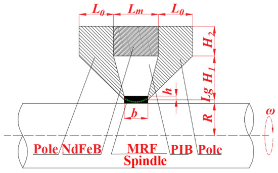 where MS is the saturation magnetic induction intensity of the magnetic fluid, BA is the magnetic induction intensity on the high-voltage side, BB is the magnetic induction intensity on the low-voltage side, rA is the radius of the high-pressure side, rB is the radius of the low-pressure side, D is the demagnetization coefficient of magnetic particles, R0 is the radius of the magnetic particle, ε is the porosity, α is the maximum deflection angle of the flux linkage under the action of an external magnetic field, L is the axial length of the gap filled with MR fluid, and b is the radial length of the gap filled with MR fluid.