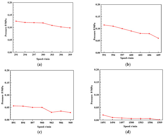 The pressure values of the measuring points were tested under the conditions of 300, 600, 900, and 1500 rpm. The test results are shown in Figure 5. The figure also shows that, as the speed gradually increases from 300 to 1500 rpm, the pressure of the MR fluid sealing device for the main shaft of the turbine gradually decreases from 0.12 MPa to zero. By observing the sealing pressure of different variable amplitudes under the same speed condition, the speed change under the low-speed condition has no effect on the sealing pressure. For the high-speed condition, the speed change amplitude has a significant effect on the sealing pressure. Simultaneously, under the same rotational-speed conditions, the magnitude of the change in rotational speed is negatively correlated with the magnitude of the sealing pressure. When the magnitude is larger, the sealing pressure is smaller.