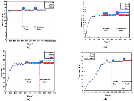 Temperature change in the MR fluid seal under different speed conditions: (a) 300 rpm; (b) 600 rpm; (c) 900 rpm; and (d) 1500 rpm.