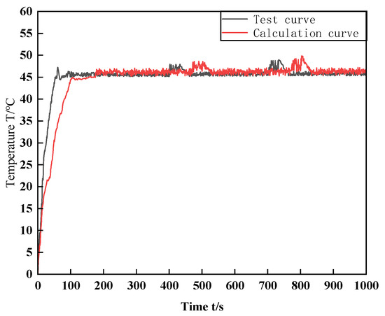 According to the test results in the previous section, this study selects the temperature test value of the MR fluid and the numerical results under the 300-rpm speed mutation condition for comparison and verification. The verification results are shown in Figure 7. This figure shows that the time of the numerical calculation curve is delayed by 100 s compared to the test curve; nevertheless, the overall trend of the numerical calculation is consistent with the experimental trend, and the temperature value after stabilization is the same. However, for the numerical analysis results in this section, only the steady-state temperature and magnetic field of the MR fluid sealing device are discussed, and the change process is not discussed. The temperature after the calculation curve and test curve are stable and fundamentally the same; hence, the numerical calculation results are consistent with the experiment results.
