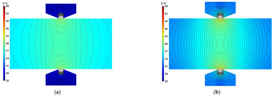 Figure 8 shows the temperature cloud diagram of the MR fluid sealing device under the condition of an external magnetic field, H = 0, at different speeds. As shown in Figure 8, as the rotation speed increases, the temperature of the MR fluid sealing device gradually increases, and the high-temperature area gradually increases. Simultaneously, by observing the same rotational speed, the maximum temperature of the MR fluid sealing device is noted in the sealing gap, which is approximately 55 °C; it then diffuses to the outside to realize heat exchange with the outside world.