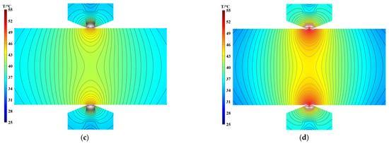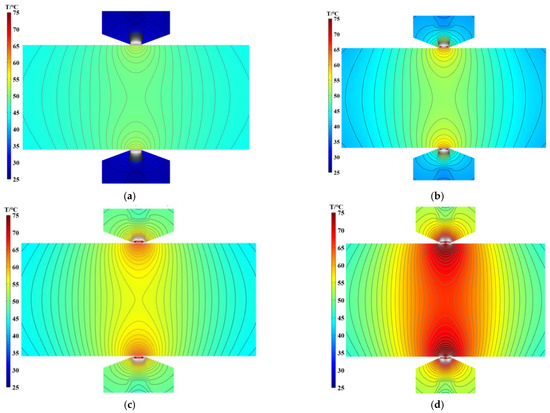 Temperature cloud of the MR fluid seal at different speeds with H = 0: (a) 300 rpm; (b) 600 rpm; (c) 900 rpm; and (d) 1500 rpm.