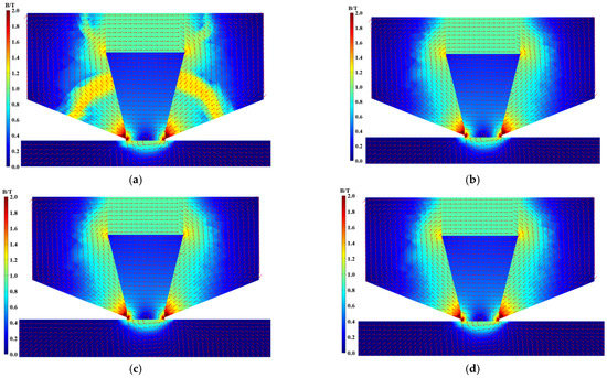 Magnetic-field cloud of the MR fluid seals at different speeds: (a) 300 rpm; (b) 600 rpm; (c) 900 rpm; and (d) 1500 rpm.