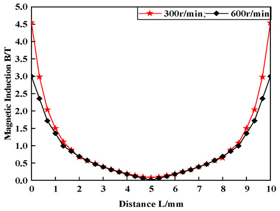 Figure 10 shows that the magnetic field results of high-speed operating conditions are approximately the same. This is due to the fact that, with a continuous increase in speed, the temperature of the MR fluid continues to rise, and the relative permeability of the MR fluid gradually decreases from 1.05 to 1. However, for the magnetic poles, spindles, rubber, and permanent magnets, a small range of temperature change has little effect on their magnetic properties. Therefore, for the entire MR fluid sealing device, the magnetic field area is unchanged under high-speed working conditions. Therefore, for further research on the magnetic field, the field results of 300 and 600 rpm operating conditions were selected for this study. According to the literature [25], it is known that the side closest to the main shaft easily causes leaks. Therefore, in this study, a section line close to the main shaft (0.05 mm) with an axial length of 10 mm is examined. The value of the magnetic field on the section line is shown in Figure 11.