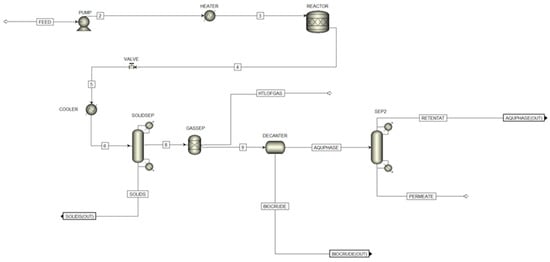 The resulting stream is depressurized and subsequently cooled down to 2 bar and 100 °C. In the solid separator, parts of the solids can be removed. Subsequently, the phase separation is performed, which results in the HTL gas phase, the aqueous phase and the biocrude phase (~200 model compounds). The remaining solids are distributed over the aqueous phase and the biocrude phase. The biocrude phase is sent to the HT unit, while the aqueous phase is further treated with a membrane upconcentration. Due to simplicity reasons, the membrane upconcentration is not modeled in detail.
