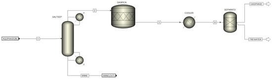Figure 4 shows the flowsheet of the cHTG process step. Since the cHTG catalyst is prone to deactivation, a salt separator has to be integrated into the process. The resulting brine phase is treated as wastewater, while the remaining stream is heated and pressurized to 450 °C and 280 bar, respectively and processed in the cHTG reactor.