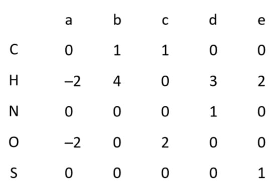 Matrix for calculating the stochiometry of a reaction as described in Equation (2) for any given compound with the formula CCHHNNOOSS.