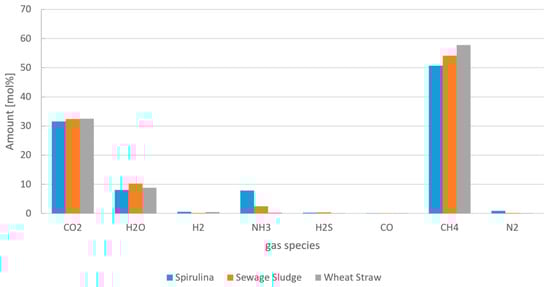 Based on the matrix calculation described earlier the retentates were converted into gas mixtures under hydrothermal gasification conditions. The gas compositions of the respective gas streams after cHTG are shown in Figure 7. Generally, the gas compositions are dominated by methane (50.7 to 57.8 mol%), carbon dioxide (31.6 to 32.5 mol%) and water (8.1 to 10.2 mol%). Literature results show that also hydrogen is produced in considerable amounts. The exact composition of the gas strongly depends on the catalyst that is used and the chosen experimental conditions. Two possible gas compositions reported in literaturecomprise 52.1 vol% and 52.4 vol% methane and 45.1 vol% and 38.0 vol% carbon dioxide, respectively, which is in good agreement with the model results [,]. Minor contributions to the modeled gas are observed from hydrogen, dihydrogen sulfide, carbon monoxide, nitrogen and ammonia. One exception is the case of Spirulina, where the amount of ammonia is quite high (7.9 mol%) due to the high amount of proteins in the feedstock and subsequent, nitrogen species in the aqueous phase. In contrast, wheat straw contains much less nitrogen in the feedstock, which is also reflected in the aqueous phase and the resulting cHTG gas phase composition. It should be noted, that the methane yield is not directly proportional to the amount of carbon distributed to the aqueous phase (TOC values), but it is also dependant on the type of compound that is converted. Wheat straw has the highest mass yield (6.7 wt%) and carbon mass yield (10.6 wt%). Sewage sludge has the lowest mass yield (5.3 wt%) but the second highest carbon mass yield (9.0 wt%), while Spirulina has the second highest mass yield (6.1 wt%) and the lowest carbon mass yield (8.9 wt%). The carbon mass yields for methane are also reflected by the share of methane in the gas mixture (Figure 7).