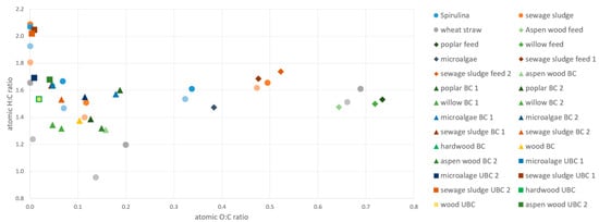 In the case of wheat straw, a smooth and steady, almost linear increase can be observed. Furthermore, the amount of high boiling components (>350 °C) is significantly higher for the wheat straw upgraded biocrude. This can be explained by the high amounts of lignin and especially carbohydrates, which lead to an increased formation of aromatic high boiling components [,], which is also supported by the low H/C ratio in the van Krevelen diagram (Figure 8).