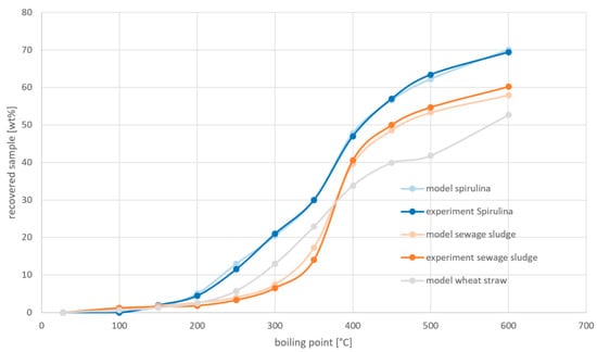The boiling point distributions of biocrudes from three different feedstocks—Spirulina, sewage sludge and wheat straw—are depicted in Figure 9. The model boiling point distributions are adapted to experimental results obtained in the HyFlexFuel project [], the good reproducibility of the experimental results validate the model. The boiling point distributions show a distinctly different behavior based on the composition of the initial feedstock. Sewage sludge biocrude exhibits a slow increase in volatile components up to a boiling point of about 350 °C, where a sudden and strong increase can be observed. This can be ascribed to the high content of long-chain fatty acids and amides, originating from the high amount of lipids present in the feedstock. About 58 wt% of the biocrude can be found at boiling points below 600 °C. For Spirulina and wheat straw biocrude, a more steady increase can be observed, whereas Spirulina biocrude shows a significant increase of volatile components starting at around 200 °C. The amount of compounds below 600 °C (70 wt%) is even higher in Spirulina biocrude compared to sewage sludge biocrude. Also biocrude from wheat straw shows a different behavior. Almost half of the obtained biocrude components can be found at boiling points above 600 °C, which indicates a high amount of polymerization reactions occurring during HTL. This is linked to the high amounts of lignin and carbohydrates present in the feedstock. Components with lower boiling points between 200 °C and 350 °C can be observed in higher quantities than for sewage sludge biocrude, but to a lower extent than in Spirulina biocrude. For wheat straw, no results for a biocrude boiling point distribution from the HyFlexFuel project have been available up to now [].