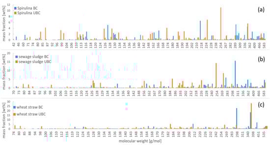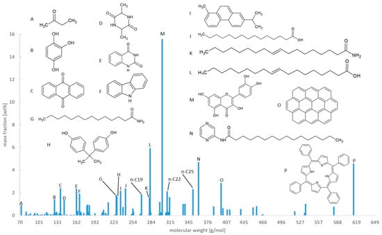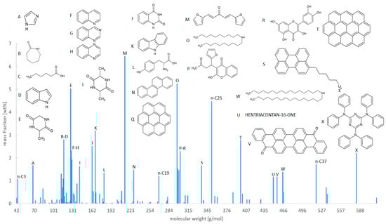 The presentation shown in Figure 10, Figure 11 and Figure 12 can be compared to an experimental GC-MS analysis, as e.g., shown in a study by Jarvis et al. []. However, some distinct differences have to be kept in mind. Firstly, GC-MS analyses do not show the exact molecular mass of the components and secondly, GC-MS results are limited to the volatile fraction of the sample, while in these figures, the exact molecular mass of the model compounds is depicted on the x-axis and there is no limitation towards high boiling components. In order to give a better overview of the different biocrude samples however, the two heaviest model compounds, namely dohexacontane (C62, 871.7 g/mol) and doheptacontane (C72, 1011.9 g/mol) are not shown. In the case of Spirulina, these two compounds have a share of 11.0 wt% and 8.2 wt%, respectively, while in the case of sewage sludge the amounts are 6.9 wt% and 4.8 wt%, respectively. In the case of wheat straw, these components do not contribute as much (3.0 wt% and 2.8 wt% respectively), because the high boiling polymerization compounds are mostly based on aromatic monomers from lignin and carbohydrate-originated compounds. Besides this, biocrudes from Spirulina and sewage sludge generally are more similar compared to the biocrude obtained from wheat straw, which is dominated by aromatic compounds and especially a larger fraction of high molecular mass components. Besides some long-chain amines (O, W), which result from reactions of lipids, the Spirulina biocrude (Figure 10) shows a variety of different cyclic and aromatic oxygen and nitrogen containing compounds (B, E, F-K) that originate from Maillard reactions of sugars and proteins or from direct dimerization reactions of proteins [,]. Furthermore, significant amounts of oxygenated cyclic or aromatic compounds (M, P, R) can be observed from the reaction of sugar products, such as 5-hydroxymethylfurfural [,], with lignin monomers or with each other. In addition, some aromatic high boiling polymerization products (S, T, V, X) are present [], but the high boiling fraction is mostly dominated by the long-chain hydrocarbons that are not depicted. In some cases, model compounds are not expected to be present in real samples in the exact same way, but they rather serve as representatives for a variety of different possible compounds that cannot be modeled easily. This is especially true for high boiling components.