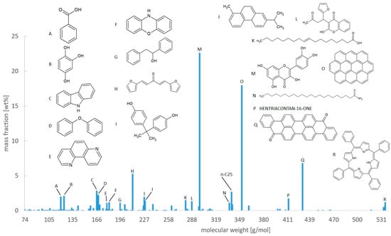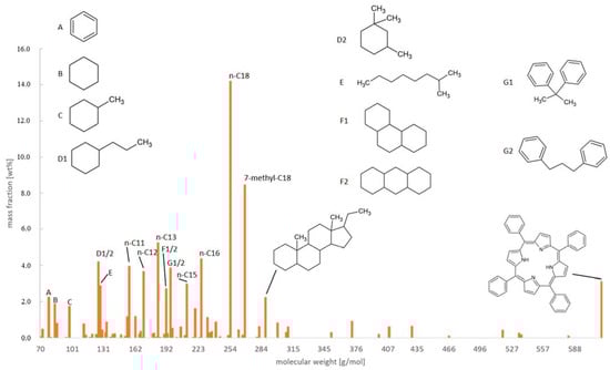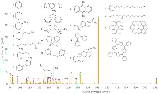 All compounds exhibiting 1 wt% or more are depicted as well. Besides one fatty acid (K) and one fatty acid amide (N), only aromatic compounds can be found. Compounds with lower molecular mass are distributed quite well, while high molecular mass compounds are only represented by a few compounds, which results in the model not being flexible and not predicting properties very well.