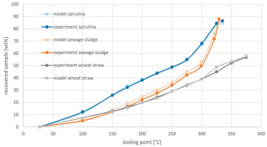 Experimental and model boiling point distributions for biocrudes from Spirulina, sewage sludge and wheat straw. For wheat straw no experimental boiling point distribution from the HyFlexFuel project is available.