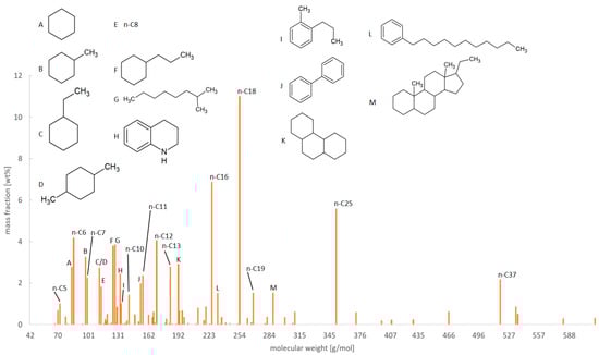 Again, the presentation shown in Figure 14, Figure 15 and Figure 16 can be compared to an experimental GC-MS analysis, as e.g., shown in a study by Jarvis et al. []. Generally speaking, compositions of upgraded biocrudes are less complicated than compositions of biocrudes, because the amount of compounds that add up to large parts of the upgraded biocrude is smaller. Figure 14 shows the molecular mass distribution of the upgraded biocrude obtained from Spirulina with the main model compounds incorporated. A prominent portion of the upgraded biocrude comprises n-alkanes from C5 up to C37, with a clear peak at C16 and C18, originating from lipid-containing species in the biocrude. Furthermore, a significant amount of the upgraded biocrude consists of cyclic paraffins (A-D, F, K, M) that originate from hydrotreating of aromatics and heteroaromatic cyclic compounds. Some of the aromatics (I, J, H, L) could only partially be hydrotreated and are still present.