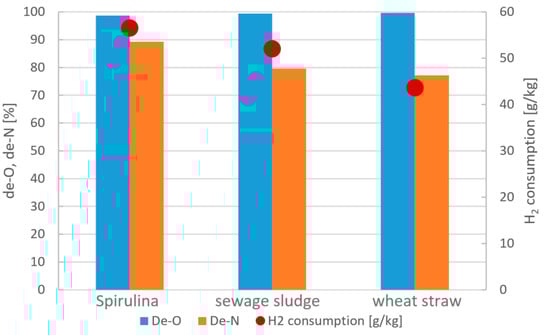 Deoxygenation and denitrogenation rates, as well as hydrogen consumption for Spirulina (left), sewage sludge (middle) and wheat straw (right).