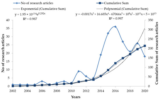 Figure 1 represents the annual growth of research articles, along with the cumulative sum of the articles and its exponential trendline fit. Even though the R-squared value of the exponential function is 0.987, the graphical representation of the model, along with the calculated value of the square root of the variance of the residuals (RMSE) [57], which is 20.38, reflects the poor ability of the exponential growth model to accurately predict the data in recent years and especially as regards the data points of the years 2019 and 2020, where the model overfits the actual data. This drop in the publications’ output must be considered in respect to the COVID-19 outbreak, as during this period many fields of science, not directly related to the pandemic, have lagged behind [59]. However, this assumption remains to be validated in the future, by comparing the publications’ production during the pandemic with the growth of publications in the forthcoming years.