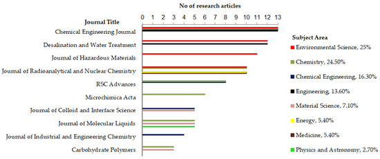 Each of the top 10 journals of Table 3 were categorized in Scopus database to either a single or multiple subject areas. The subject areas can provide a better understanding of the focus of the research, compared to what is revealed by assessing only each journal’s title. Figure 2 shows the number of articles published in each journal along with the subject area/areas that each journal belongs to. Seventy-three percent of the 77 publications fell into four subject categories: “Environmental Science”, “Chemistry”, “Chemical Engineering”, and “Engineering”. In that respect, environmental protection can be considered as the driving force for research related to Co(II) removal from wastewater. Moreover, research on the removal of Co(II) from radioactive wastewater was limited, as “Energy” and “Medicine” subject areas accounted each only 5.40% of the publications. Furthermore, “Chemistry” was a major subject of research, accounting for 24.50% of publications. Furthermore, even though nano-adsorbents are nanomaterials, and thus “Material Science” subject could be expected to serve as a major contributing category, it accumulated only 7.10% of the publications.