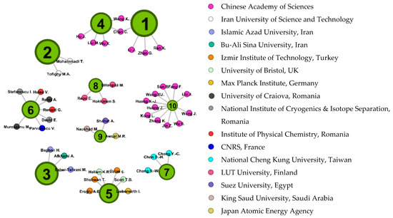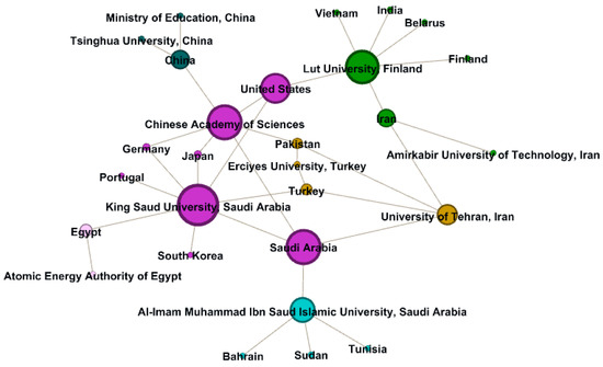 Interestingly, some other countries, such as Germany, Japan, and Pakistan, have found their way into being affiliated by more than one institution. Iran was followed by China in BC (47 compared to China’s 51) and clustered together with LUT and Amirkabir Universities, while China was clustered along with Tsinghua University and the Chinese Ministry of Education and not with the Chinese Academy of Science, which was identified as the main contributor of research papers in Table 4’s data. The case of the Chinese Academy of Science is interesting because the visualization in Figure 4 showed that this institution (which is a large research organization comprising over 100 institutes [64]) not only had many domestic authorships, but that its role could be considered as intermediary between the two other Chinese institutions (with exclusive domestic co-authorship) and foreign partners.