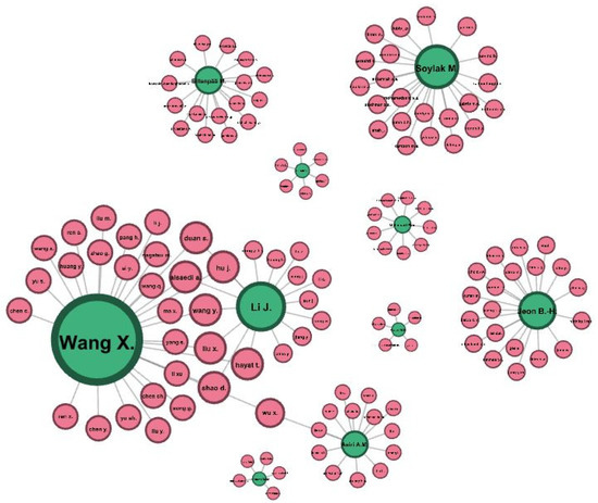 In order to identify authors’ influence, the collaboration network of the top-10 authors was visualized using Gephi software. Before being entered in Gephi, the Scopus dataset was processed in Excel, so that all co-authors’ names to be coupled with their corresponding Scopus ID, thus avoiding evaluating co-authors who shared the same name but different Scopus’ IDs as one. Gephi’s ForceAtlas algorithm was run on the dataset and the resulted visualization is presented in Figure 4. The authors are represented with green colored nodes and are connected, through links (edges in Gephi’s terminology), with their respective co-authors, represented with pink colored nodes. The thicker the edge linking two nodes, the more intensive was the collaboration between these two nodes. From the visualization it is easy to understand that typically all authors published papers more frequently with certain co-authors. The authors ranked in the first two places Wang X. and Li J., both from the Chinese Academy of Science, had three in common publications and shared seven co-authors. Wang X. also shared one co-author with Asiri A.M., from King Abdulaziz University of Saudi Arabia. The rest of the authors did not share any co-authors with one another. Eigenvector is another micro-level metrics of centrality used to analyze the co-authorship network and identify the influence of an author within the network. An author, which is connected to many other co-authors that are themselves well-connected, has a high eigenvector centrality and an author connected to few co-authors who also have a few connections has a much lower score [65]. Thus, in the representation in Figure 4 the nodes were sized in respect to the value of the of the eigenvector centrality of each author and co-author in the network structure. Nodes’ labels font sizes were in accordance with the nodes’ size. Considering the eigenvector centrality values (given in parentheses), Wang X. (1) and Li J. (0.47) were ranked first, as those two authors shared many co-authors, while Soylak M. (0.40) followed, as he exceeded the rest of the authors, demonstrating high number of both publications and CI, as noted in Table 5’s data. The collaboration network of the top 10 authors had (i) a graph density [65] of 0.014, meaning that only 1.4% of the possible connections in the network occurred and (ii) an average degree [65] of 2, meaning that only two, on average, authors were connected in the network As a result, such analysis can provide the basis for the possibility to optimize collaboration between main and non-mainstream authors, and to strengthen and tighten the existing collaborations, so as to build a stronger network in the future [66].