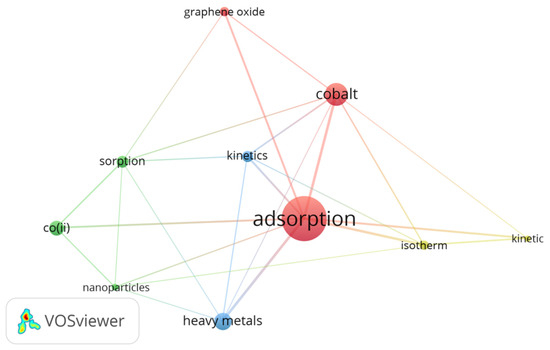 From the representations in Figure 5, we can understand that the more general terms were more frequently selected by the authors’ as keywords for their publications. The term “adsorption” dominated the graph, presenting the highest occurrence value (54), followed by the term “cobalt” (27). However, note that instead of those terms, authors’ indexed their publications using, respectively, the terms of “sorption” (13) and “Co(II)” (17). The term “heavy metals” (20) also stood out in the graph and then followed the general terms referring to kinetics and isotherm studies of adsorption, indexed in descending frequencies as “kinetics” (12), “isotherm” (10), and “kinetic” (6). The general term “nanoparticle” (7) was the most frequently used term to index nano-adsorbents’ publications, while, the term “graphene oxide” (10) was the only specific term, characterizing the type of the nano-adsorbent, included in the map of the top-10 co-occurred authors’ keywords, co-existing (in the same cluster) with the major terms “adsorption” and “cobalt”, demonstrating thus, the importance of this type of carbon-based nano-adsorbent for cobalt removal from wastewater.