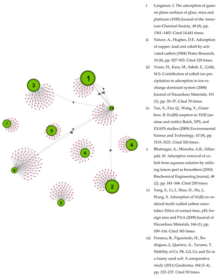Co-occurrence of citations is a tool also used to identify fundamental literature on a certain topic, as when research groups cite a common set of papers, these co-citations indicate works that may contain key concept equations, experiments, or results and thus are usually frequently cited, in terms of bulk citations [46]. That is clearly the case of reference (i) corresponding to the fundamental work of Langmuir (1918), cited 14,441 times, where the Langmuir’s adsorption model was presented. In reviewing (ii)–(vii) co-citations, shared in Figure 8′s network: (ii) Netzer et al. (1984) paper, cited 229 times, was referring to cobalt removal from wastewater using activated carbon, effective adsorbent for removing metallic species from wastewater, though not extensively applied due to its high cost [69], (iii) Yüzer et al. (2008), cited 70 times, was used in reference to the forms of cobalt in various pH values. (v) Bhatnagar et al. (2010) work on lemon peels bio-sorbent of 25.6 mg/g adsorption capacity, cited 250 times, was used to compare nano-adsorbents’ capacity for Co(II) removal to other sorbents. While, the rest of the co-cited publications were used to cite more general aspects of research, such as the presence of heavy metals in various industrial influents (Yang et al. 2009, cited 345 times) and the various materials that have been used as heavy metals’ adsorbents (Tan et al. 2009, cited 320 times and Fonseca et al. 2011, cited 50 times).