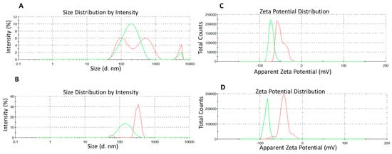 Characteristics of the optimized nanoemulsion systems: (A) A-NE and (B) I-NE systems along with hydrodynamic diameter (DH); (C) D-NE and (D) F-NE along with zeta potential for freshly prepared formulations: after sonication (red line) and after using microfluidizer Panda (green line).