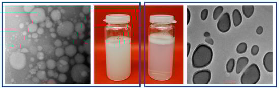 Transmission electron microscopy (TEM) and images of the optimized nanoemulsion F system (left after sonication, right after homogenization).