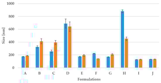 Changes in the size of NE during 30 days (gray after preparation) on storage at 25 °C; in blue—size after preparation, in orange—after 30 days.