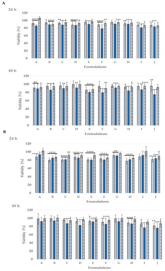 Cytotoxicity of the studied nanoemulsion A–H upon normal human skin cells: NHDF fibroblasts (A) and HaCaT keratinocytes (B) incubated for 24 h and 48 h; **** p < 0.0001, *** p > 0.0001, ** p < 0.001, * p < 0.05; dilutions