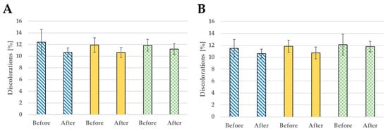 Discoloration reduction after 28 days of use: formulation E (A) and formulation G (B); probants’ age: