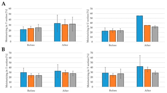 The moisturizing effect after 28 days of using: formulation G (A) and formulation G (B); probants’ age: