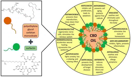 Technically, oil-in-water (o/w) emulsions are mixtures wherein water is the continuous phase and oil is the dispersed phase, often stabilized by one or more surfactants. These surfactants can be natural or artificial, and they are useful to reduce the surface molecular tension between oils and liquids. Nanoemulsions are an advanced part of emulsion nanotechnology and are usually produced by ultrasonic liquid processors that break the dispersed phase down into 10–500 nm droplets, which are much smaller than the range for conventional emulsions. They are kinetically stable colloidal delivery systems suitable for the protection, delivery, and encapsulation of active compounds. Nanoemulsion is being studied as an effective delivering tool for several diagnostic and therapeutic applications including structural design processes [16,17,18]. A previous study suggests also that nanoemulsions significantly increase the transdermal bioavailability of vitamin E and C [18]. To produce long-term stable o/w nanoemulsions, it is necessary to use a suitable surfactant and technology. The type of carrier oils and not oils is a very important factor to create a physicochemical stable emulsion, since they may help to protect the emulsion against Ostwald ripening, which is the driving force that destabilizes an emulsion by droplet coarsening. The components of the formulation must remain compatible to create a stable system. The tendency to destabilize during storage through different mechanisms (Ostwald ripening, gravitational separation, coalescence, flocculation) necessitates the application of different surfactants to attain long-term stability. Studies demonstrated that commonly a mixture of surfactants performed better than single surface-active molecules [19,20]. With this in mind, we have designed and engineered a novel o/w nanoemulsion (Scheme 1) stabilized by a mixture of two surface-active agents: polyethylene glycol sorbitan monooleate and surfactin encapsulating the CBD oil. Polyethylene glycol sorbitan monooleate is a non-ionic surfactant and emulsifier often used in foods, cosmetics, and medications. The lipophilic group constitutes part of the structure is delivers exogenous oleic acid, which can directly incorporate itself into the cells and affects cell membrane properties [21].