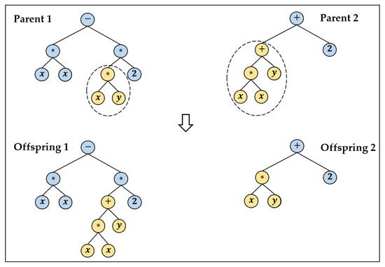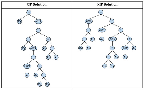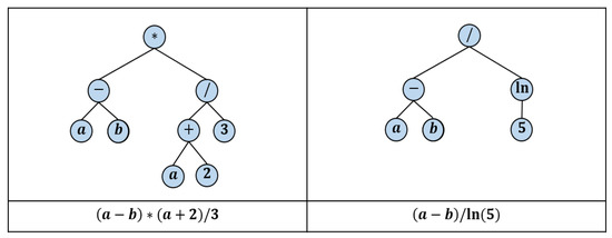 GP is an extension of the conventional Genetic Algorithm (GA), which is inspired by the biological processes of natural selection and survival of the fittest [24,38]. The main difference between GA and GP lies in representing a solution, where GA usually uses an array of bits to represent a solution. In contrast, GP deals with functions (computer programs) represented as tree data structures [24,25,26]. Each tree in GP comprises sets of nodes, where internal nodes represent algebraic and/or logical operators. In contrast, the external ones, called terminals, represent the numbers and data variables of the given problem. Figure 1 depicts examples of binary trees representing mathematical functions, where each function can be seen as a computer program.