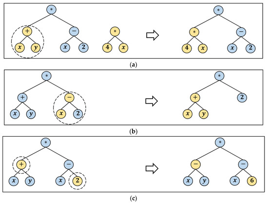 Figure 3. Advanced mutation operators implemented in GPLearn. (a) Sub-tree mutation, (b) Hoist mutation, and (c) Point mutation.
