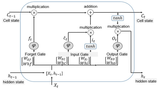 The output of the forget gate is calculated using Equation (7). Then, the output of the input gate is calculated using Equation (8). The state of the cell is computed using Equations (9) and (10), consecutively. Finally, the output of the cell is found using Equations (11) and (12).