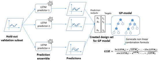 The hybrid LSTM-based GP approach consists of an ensemble of homogeneous LSTM-based predictors and a heuristic GP-based combiner. Two versions of the GP combiner have been examined, and they are set up as follows: