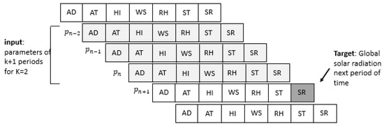Finally, we have applied the sliding window technique to prepare the sequential inputs for each LSTM model in a pre-processing phase. During the training phase, the sliding window prepares the sequence of input vectors to include the data records on the 15-min slots of time before slot to predict the GSR for the slot . In this case, the input sequence contains the data records related to the 15-min sized slots , , …, until , and the output target is the GSR for the th period. The sliding window technique is shown in Figure 7.