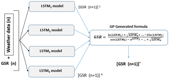 The above-described methods and most of the reported approaches in the literature that use the GP-based techniques for predicting SR and other types of energies apply the GP directly in the weather parameters. In this research, we propose a hybrid framework that uses the GP on finding the optimal combination formula of the outputs of time-series data predictors of the Long-Short term Memory (LSTM) type. We believe that applying the GP or any other heuristic optimization technique directly on weather and solar data will not cope (handle) with this data type [32,33,35]. The proposed hybrid framework employs the GP in a post-processing phase to combine outputs of base recurrent predictors of type LSTM [36,37]. The LSTM is a gated machine learning model that is trained using the gradient-based Back-Propagation Through Time (BPTT) algorithm. The BPTT is a new version of the classical back-propagation gradient descent algorithm suitable for recurrent models. Nowadays, the LSTM models are considered one of the most prominent Recurrent Neural Networks (RNN) models for deep learning to solve time-series data forecasting problems. They are suitable for modeling and handling time-series data frames by handling the temporal context among serial data records. The proposed method combines the superiority of LSTM models to model time-series data with the capacity of heuristic models to explore the best nonlinear combination formulas. The base forecasters and the heuristic combination module were designed for the short-term prediction of SR intensity.