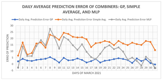 The daily average prediction error of GSR of the simple average combiner, the best stacking model MLP, and standard GP combiner during March 2021.
