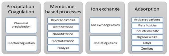 Precipitation–coagulation methods can remove high concentrations of pollutants [24,25] and are competitive in terms of treatment costs; however, they generate large amounts of sludge and dissolution of elements in treated effluents [21,23]. Membrane separation processes operate at low temperatures and are not pH-dependent but require high pressures, and their costs are often high [10,20,25]. Ion exchange methods can be selective, work with trace concentrations, and, in some cases, resins can be regenerated; however, they are highly pH-dependent and their costs are high [12,25]. The adsorption advantages include low cost (profitability) and the adsorbent materials’ versatility, as well as the possibility of reusing them [20,21]. The disadvantages described are often pH dependence and interference from ionic species [20,22].