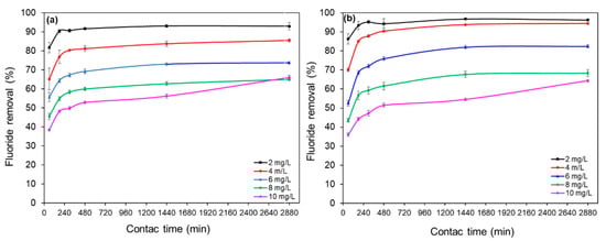 Fluoride removal (%) by bioadsorbents vs. contact time. (a) Orange peel, (b) apple peel.