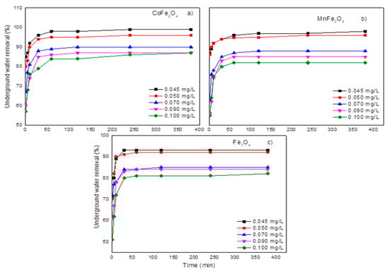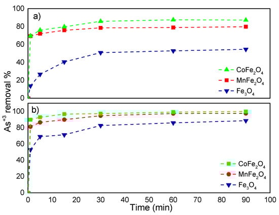The maximum As removal with the three MNPs at all initial concentrations assayed was achieved after 30 min. As Figure 4 shows, the As removal (%) is correlated with the initial As concentration in working samples. The As maximum ion removal with CoFe2O4, MnFe2O4, and Fe3O4 (98%, 95%, and 93%, respectively) was achieved in working samples with the lowest As (0.045 mg/L) initial concentration. Podder and Majumder [65] reported that the maximum As ion adsorption was achieved after 80 min with SD/MnFe2O4 composites; in this study, less contact time was enough to achieve the highest removal efficiency (98%).