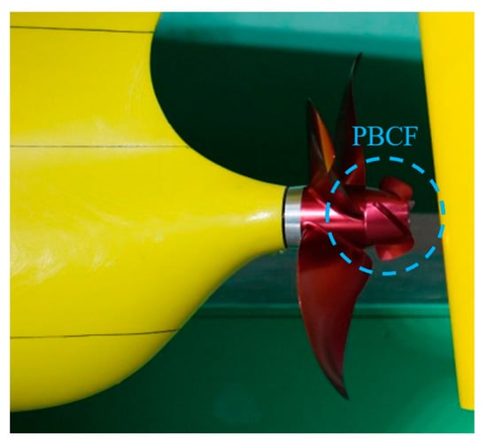 The POW test described in Section 2.2 is performed under open water condition that the inflow is not affected by the surrounding environment to measure the propeller characteristic only. In this case, the towing direction of the carriage is determined so that the inflow to the propeller is uniformly formed without being affected by the shaft as shown in Figure 3a. However, open water condition cannot be applied to test for estimating PBCF performance. The reason is that the PBCF affects the hub vortex generated in the wake of the propeller as shown in Figure 2. However, in a general POW test, the hub vortex is not generated since the shaft is located in the wake of the propeller.