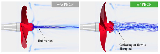 Figure 14a shows simulation results for streamlines of the hub vortex with and without PBCF. The hub vortex that was strongly developed by gathering of the flow at the end of the boss cap was broken due to the PBCF. This was because the tip of the PBCF had the shape of a divergence cap so that it could forcibly separate the flow. The corresponding pressure field is shown in Figure 14b. It was recognized that the strong negative pressure due to rotating momentum of the hub vortex was suppressed by the PBCF. This effect contributed to increase the thrust of the propeller because the extinction of the negative pressure located in the wake direction reduce drag of the structure.