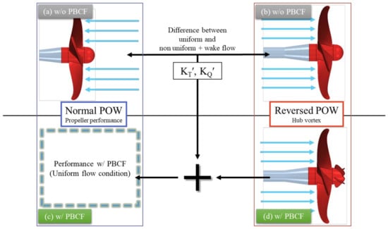 Firstly, POW and rPOW tests were respectively conducted for the propeller without PBCF as shown in Figure 3a,b. Secondly, absolute differences (, ) between and measured in the two tests were obtained. These values were assumed to be the difference in the uniformity of the inflowing flow. As shown in Figure 3d, the rPOW test was also conducted for the propeller with PBCF. Now, by adding and to the rPOW result, the difference between non-uniform and uniform flow can be corrected. Finally, open water performance of the propeller equipped with PBCF could be obtained as shown in Figure 3c.
