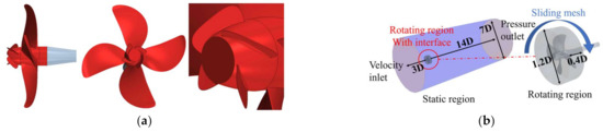 Figure 8b shows the size and boundary conditions of the numerical tank used in the POW test. The numerical tank was composed of a rotating region included the propeller where the domain rotated and a static region that was an external environment. As for the boundary condition, similar to the resistance test, the flow velocity and the pressure gradient were calculated based on the velocity inlet and the pressure outlet. Other side boundaries were set as the slip-wall.