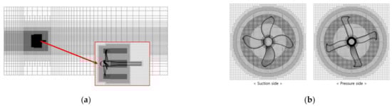 Figure 9a,b shows the snapshot of the grid system in the longitude-sectional plane and the transverse-sectional plane, respectively. The high-resolution grid was generated to concentrate only near the propeller structure in the entire computational domain. In particular, the grid refinements were adopted near the tip and hub of the propeller blade, where vortex generation is expected. Also, these refinement regions were extended toward the propeller wake for sufficient transport of the tip and hub vortexes.