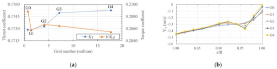 To conduct the grid convergence test, five grid systems were generated for the rotating region (G0: 720,895; G1: 1,422,222, G2: 4,063,483, G3: 7,164,420; and G4: 17,724,697). Results are shown in Figure 10a. Here, the x axis represents the number of grids. The left axis and dotted line represent KT. The right axis and solid line represent the prediction result for 10KQ. As for 10KQ, there was a large variation in G0–G1. It was within the convergence range by maintaining relatively small changes in G2. On the other hand, KT showed convergence at the high resolution after the G3 with a large variation at G0–G3. This was related with the resolution change near the propeller tip. This could be confirmed indirectly from the distribution of the mean tangential velocity for each radius shown in Figure 10b. In this study, in order to maintain the engineering sense as in the resistance test, the G2 grid system was finally used by compromising some analysis accuracy of the tip vortex. At this time, the grid number was set at about 4 million in the rotating region and 6 million in the static region for a total of 10 million. The reason why the static region had a higher grid number was the grid refinement near the tip and hub for minimize numerical errors due to development of the tip and hub vortex as shown in Figure 9a.