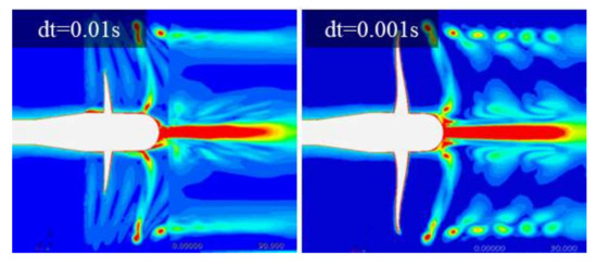 Figure 11a shows estimation results of KT and 10KQ according to time-step in the grid system of G2 together with the rotational angle of the propeller per time-step. When the time-step was 0.001–0.0005 s, results almost converged, in which the rotational angle per time-step was about 3 degrees. For reference, ITTC [45] recommends the rotational angle per time-step to be set at 0.5–2 degrees when estimating the propeller performance using the CFD simulation. Similar results were obtained in this study. However, as shown in Figure 11b, there was no significant difference in the mean tangential velocity at each propeller radius according to the time-step, which showed the same trend for radial and axial velocities. This means that the variation of the mean flow field according to time-step is small. Figure 12 illustrates vorticity distribution around the propeller. It showed large variations of the flow continuity around the interface between two time-step. Thus, such difference in propeller performance estimation according to time-step was mainly caused by the motion processing rather than the accuracy of the flow estimation. Therefore, for engineering purposes, in this paper, the time-step was set at 0.01 s which showed a difference of 0.5% from the converged result in the POW test. However, in the self-propulsion test in which the interaction between hull/rudder and the propeller wake at each time-step was important, the time-step was set at 0.001 s. The computation time spent per each ship speed was about 20 h using an 8-core Intel I7-5960 CPU.