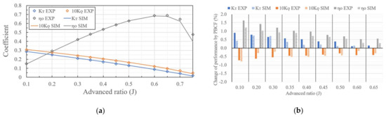 Figure 13a shows the propeller performance for each advance ratio without PBCF. Here, the solid line indicates estimated values from the simulation and markers indicate the experimental value. From top to bottom, ηO, KT and 10KQ were plotted. On the graph, the difference between simulation and the experimental results were small that qualitative comparison was difficult. At an advance ratio of 0.6 or less, the average relative error was about 1% and the maximum error level was about 2%. However, at an advance ratio of 0.7, a large error of more than 4% was found. Since the propeller’s operational advance ratio at the self-propulsion point was 0.4–0.45, this error level would have little effect on the self-propulsion performance estimation.
